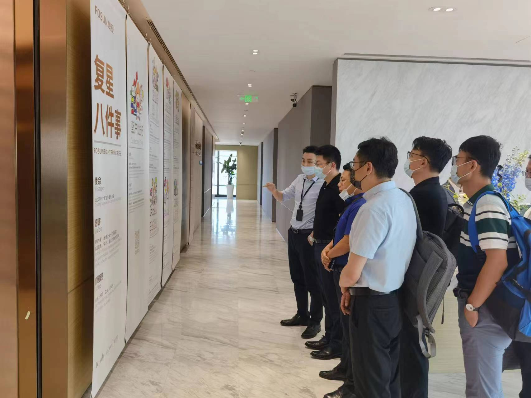 在复星全球合伙人、复星创富执行总裁、联席COO徐广成的陪同下,余冠敏一行参观了展厅内的复星集团发展情况、业务板块、企业文化等宣传材料。